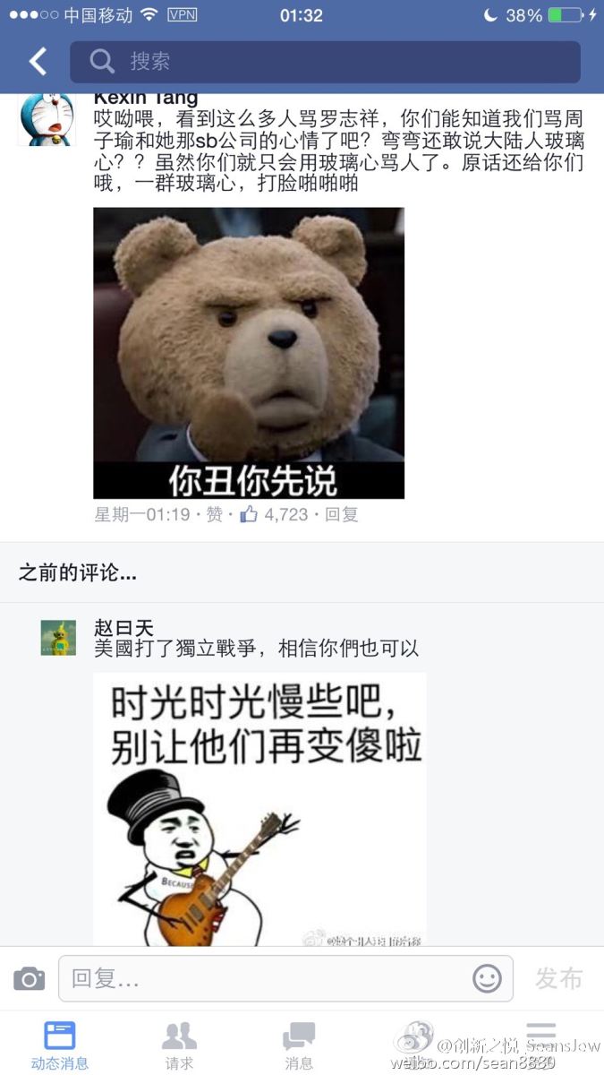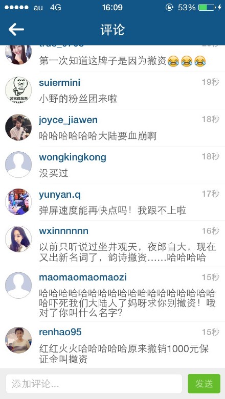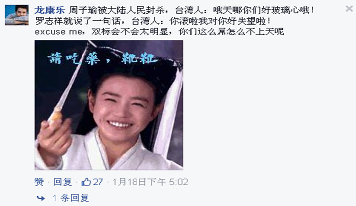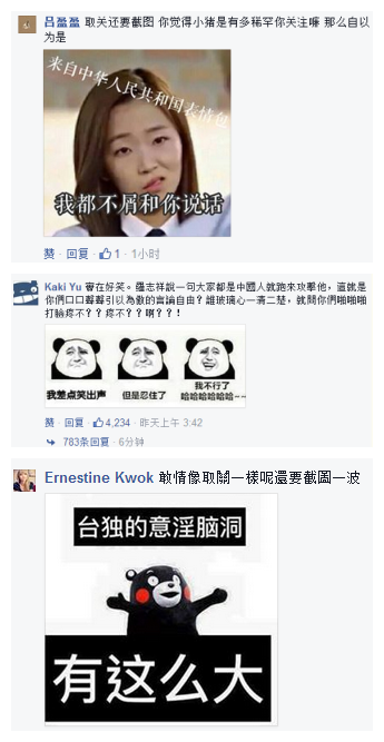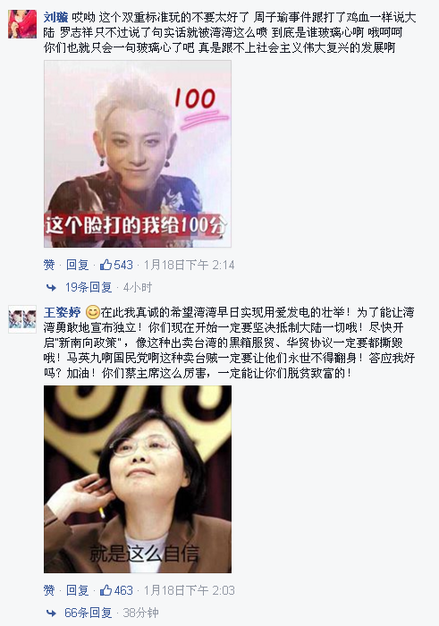 1月19日,何韵诗在ins上声称要将她开的网店“Hall1c”关掉:“我决定效仿李嘉诚,将Hall1c网店全面撤资。” 不少网友到评论区开启群嘲模式:“1000人民币保证金也叫撤资啊?哈哈哈哈哈哈,麻麻我好怕我没有袜子穿了啊啊!” “哈哈哈!好害怕哦,以后没有袜子穿了!一千块都不给我!” 其实,何韵诗这次“祸从口出”,导火线还是周子瑜。她曾就周子瑜事件在Facebook上发文,对周表示同情,称港台艺人和娱乐公司是在“委屈求存”。 上周周子瑜道歉后,耿直的爱国BOY林更新同学在转发道歉视频的时候,一不小心说了实话—— 于是,林更新的FB一下子就被怒火攻心的台湾网友攻占了,大陆网友自然坐不住了,我家的明星怎么能这么任你欺负。什么你说大陆人民上不了脸书?拜托那不就是一键翻墙的事情。 脸书表情包之战就此展开。金星、wuli滔滔、马云爸爸,习大大、刚当选台湾地区新领导人的蔡英文都被网友们做成表情包。 近日,罗志祥被问及“作为台湾艺人,跟大陆的嘉宾合作有什么感觉?”他回答:“不要分那么细,大家都是中国人。”他的FB被台湾网友攻占,12小时内掉粉4万。第二轮表情包大战又轰轰烈烈地开始了。 而昨日,来自台湾的“朝阳群众”黄安将微博逐条删除,此事一出,网民们又坐不住了。