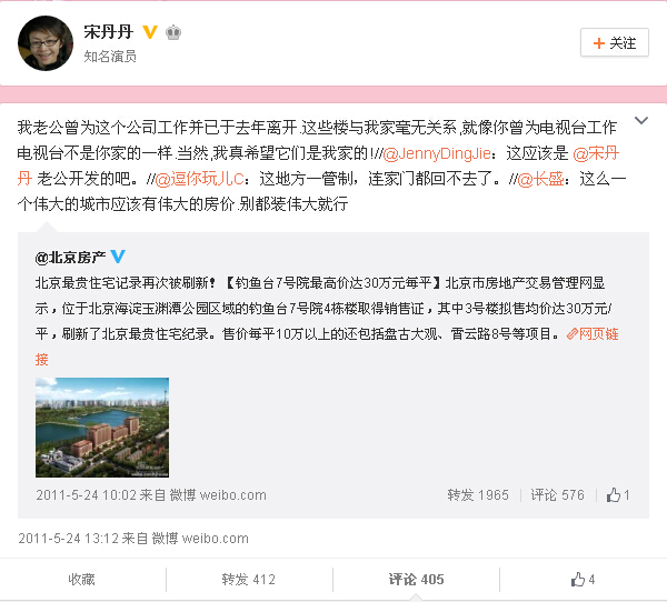 网上有帖子称宋丹丹居住是钓鱼台七号院,2011年每平米售价就高达12万。事实上,钓鱼台七号院最贵一套住房售价每平方米30万,曾刷新中国大陆豪宅的房价记录。