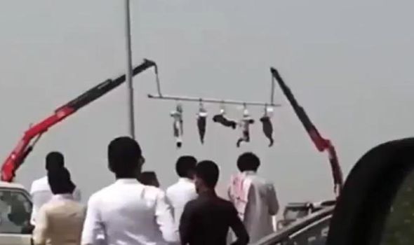 在一组镜头中,沙特街头,五具尸体挂在一根用起重机吊起的杆子上,被公开展示,提醒那些可能正考虑犯罪的人们。这5个人是强盗,此前被公开斩首,然后他们的尸体就被挂着示众,已经几天了。