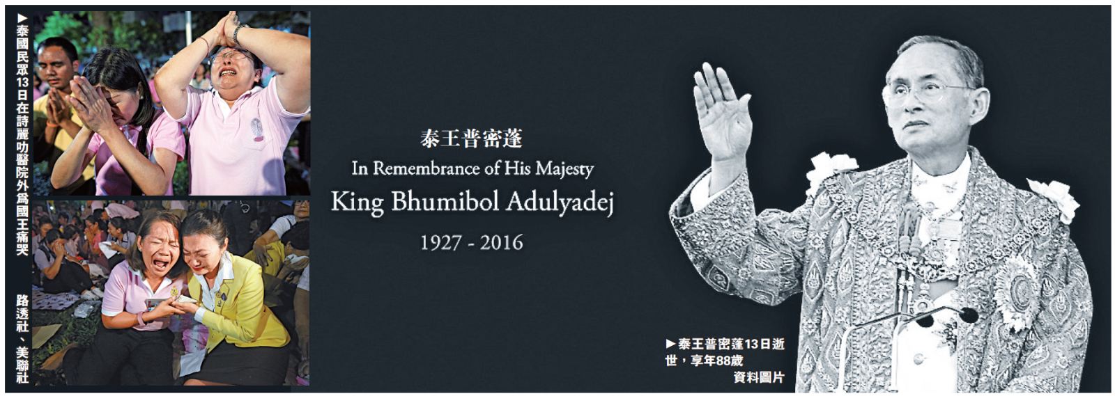 摘要:大公网10月14日讯 综合新华社、泰国《民族报》及法新社报道:泰国王宫宫务处13日晚间发布公告称,泰国国王拉玛九世普密蓬.阿杜德于当天15时52分驾崩,享年88岁。当晚,成千上万名泰国民众聚集在国王所在的诗丽叻医院,听闻国王去世的消息无不痛哭落泪。为稳定政局,泰国总理巴育当晚发布电视讲话指,泰王早于1972年钦定王储哇集拉隆功为继承人。自从宫务处9日公布泰王健康状况不稳定后,就有大批民众到诗丽叻医院为国王祈福,希望他早日康复,许多人守候多日,于当晚听到消息不敢相信。
