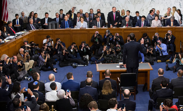 在一座对添油加醋的表演和令人难以置信的国会证词习以为常的都城里,长达两个半小时的时间里,房间里的人陷入了焦灼的静寂。偶尔刺破这静寂的,是一名已经遭到解职,且个人声誉的躯体上插满特朗普牌刀子的联邦调查局局长,用他的陈述引起的阵阵惊呼。证人作证时,参议员们报之以颇为上镜的注视还常常交头接耳。