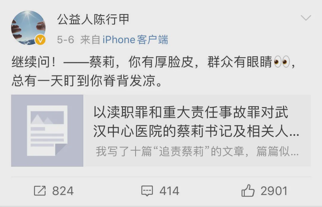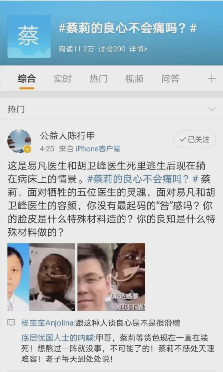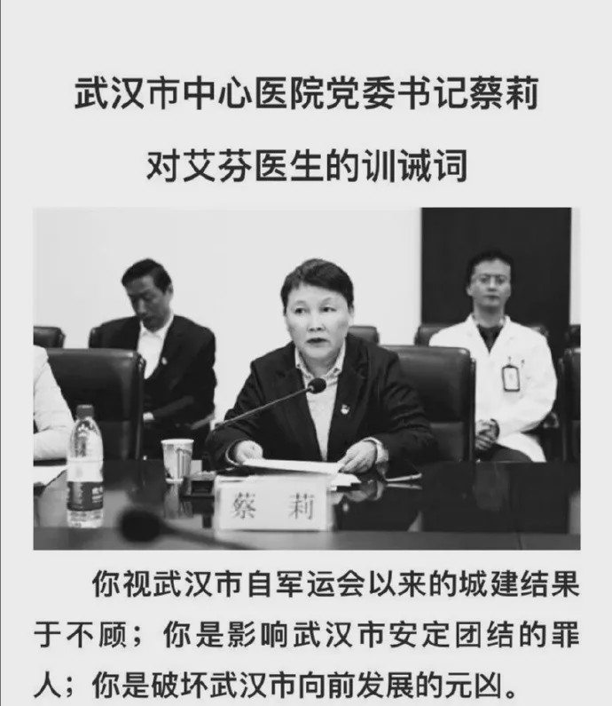 被陈行甲质问的蔡莉,系武汉中心医院党委书记。很多人都知道,由于她的“冷血”,致这家拥有4000多名职工的医院,痛失5名优秀医生,200多人确诊。至今,没有任何单位和个人出面表态或说明情况,更谈不上问责她,调查她。