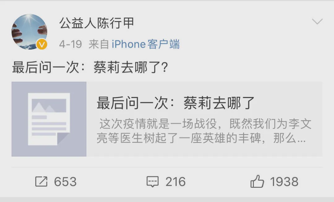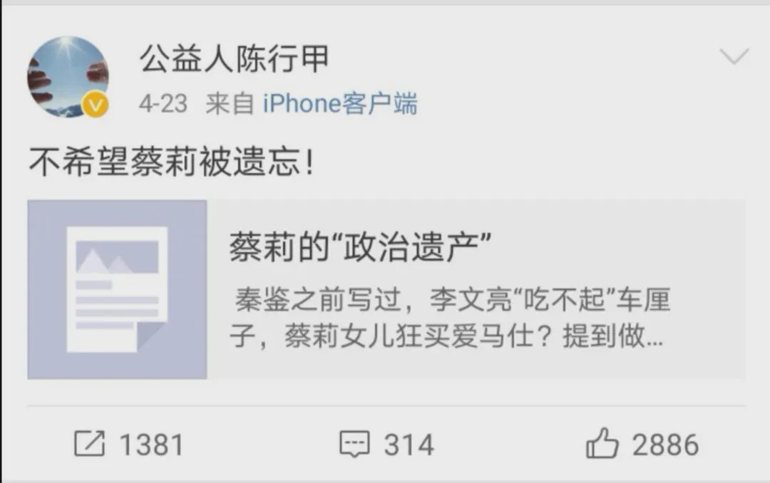 4月25日,陈行甲在微博上公开发文质问蔡莉:
