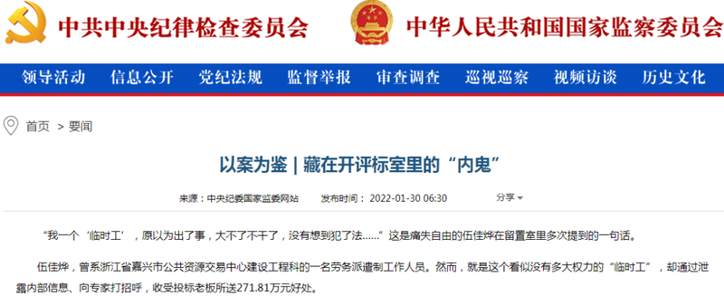中央纪委国家监委网站1月30日发布“以案为鉴”文章,讲述了浙江省嘉兴市公共资源交易中心建设工程科的一名劳务派遣制工作人员受贿的案例。