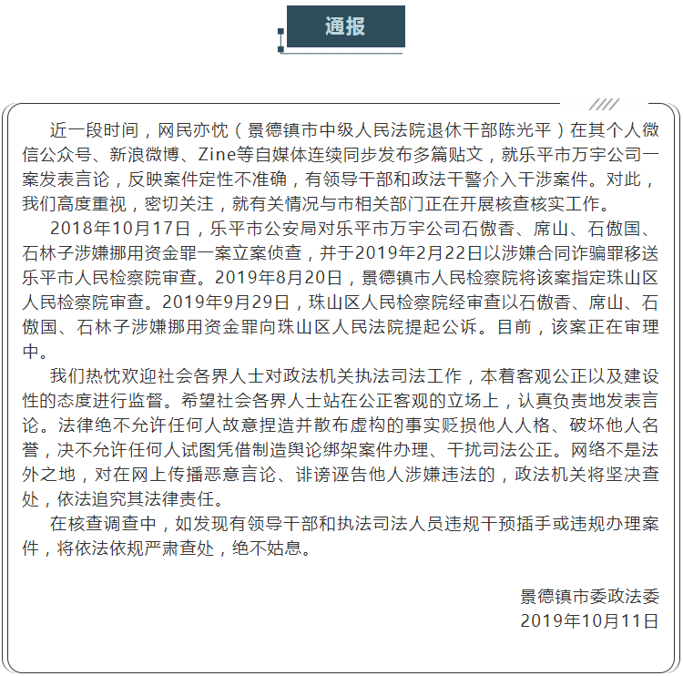 陈光平的发帖,引起了当地相关部门的重视。2019年10月11日,景德镇市委政法委通报称,针对陈光平在网上发帖反映的情况,相关部门正进行核查核实,而对在网上传播恶意言论、诽谤诬告他人涉嫌违法的,政法机关将坚决查处,依法追究其法律责任。