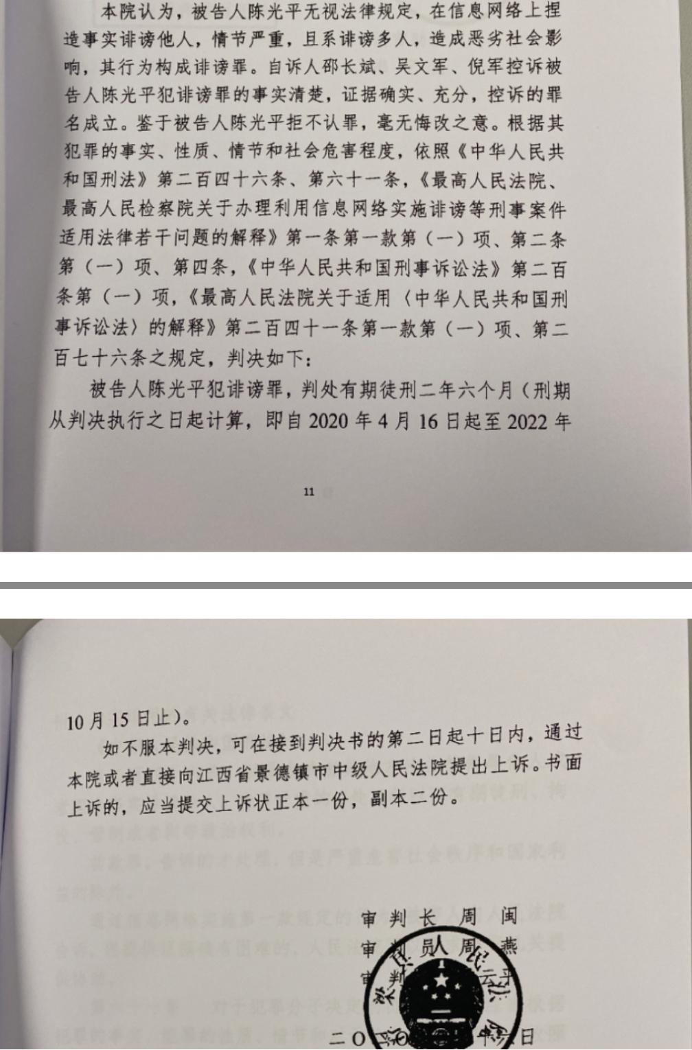2020年4月16日,浮梁县法院公开开庭审理此案并当庭宣判,陈光平被判诽谤罪获刑两年六个月,并被当庭收监。