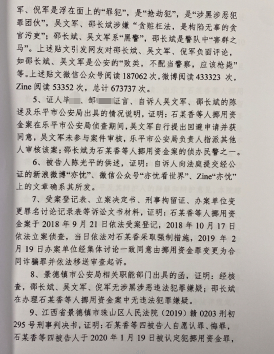 判决书显示,法院经审理查明,2019年9月3日至2019年12月28日,被告人陈光平使用昵称为“亦忱”的新浪微博、Zine和昵称为“亦忱看世界”的微信公众号,在网上发帖30篇,捏造邵长斌、吴文军、倪军“警黑勾结,罗织罪名构陷无辜,炮制一起典型刑事假案,使石某香等人陷于牢狱之灾”,并污蔑邵长斌、吴文军为“黑警”,三自诉人为“罪犯”“抢劫犯”“涉黑涉恶犯罪团伙”。相关贴文被点击、浏览累计67万余次,引发网民对邵、吴、倪三人的负面评价。